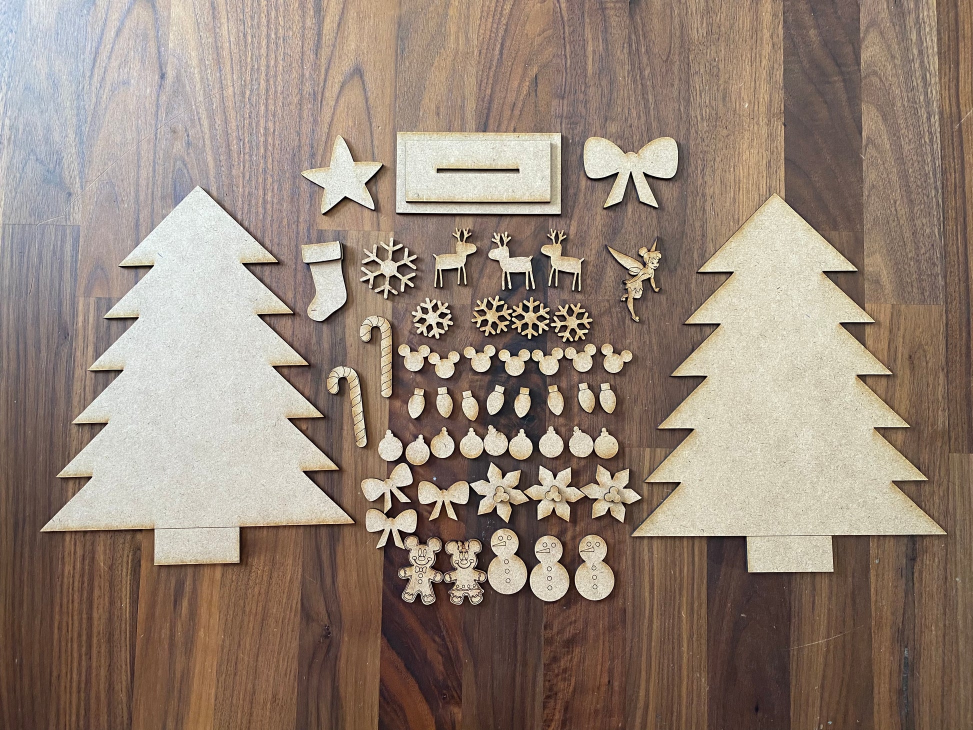 It comes with 2 trees, 2 stands, and all the decorations. Along with 3 paint colors: Red, Green, and a glitter paint. and a paint brush.