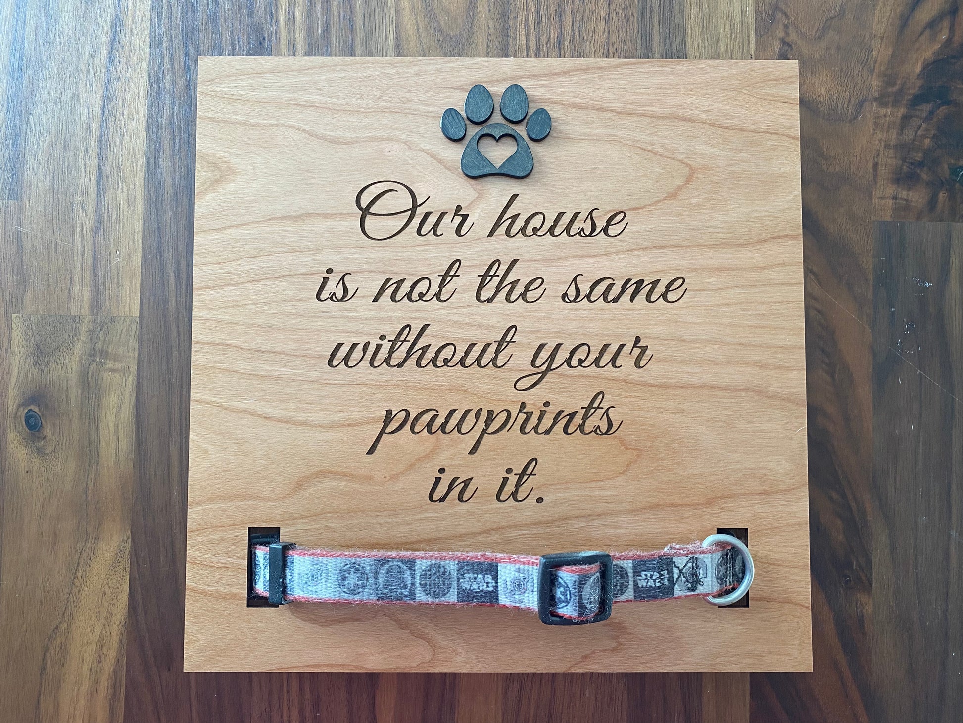 This memorial plaque is 9.5 by 9.5 inches and can hold a collar.