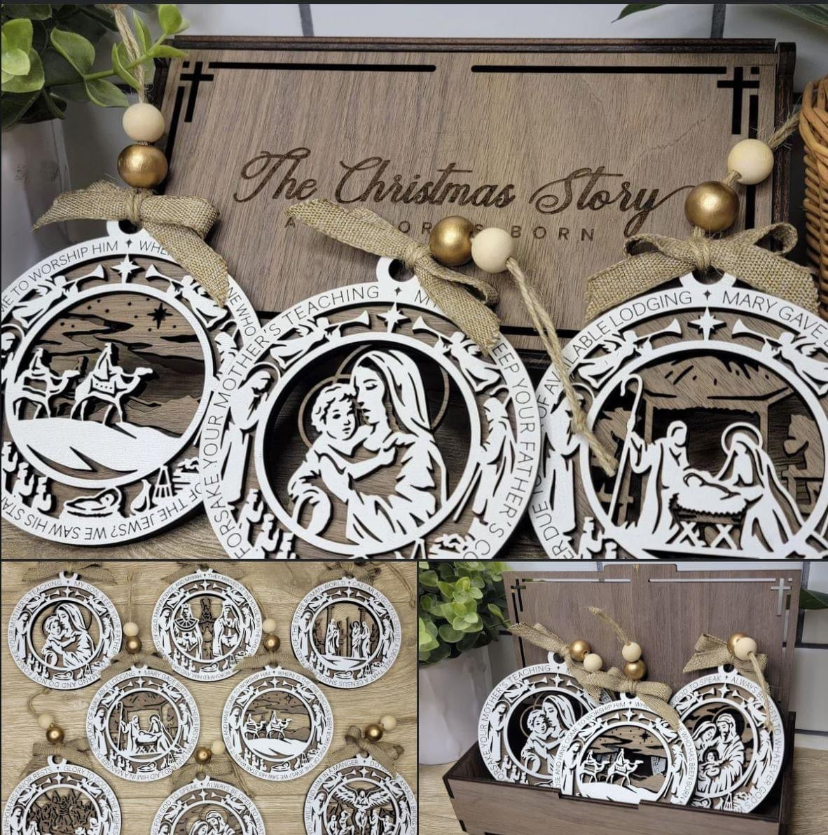 8 beautiful wood ornaments that tell the story of Jesus’s birth in a wood box.